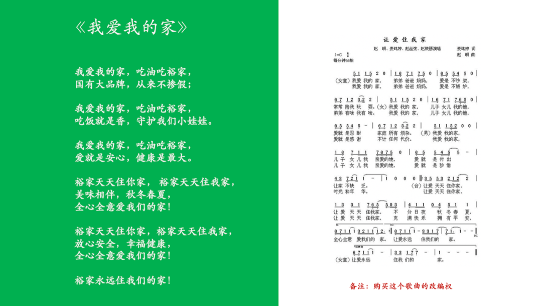 我們尋找到尋消費(fèi)者耳熟能詳且心智中最熟悉的歌曲、電視劇名為品牌賦能,尋找到連小孩子都喜歡表達(dá)的情感口語——“我愛我的家”為品牌賦能,提煉出裕家品牌的超級(jí)口號(hào)——
