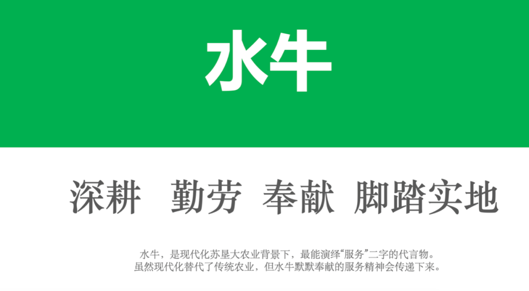 于是我們從中國(guó)千年農(nóng)耕文化中的默默服務(wù)者——“水牛”身上找到靈感的載體,水牛就是農(nóng)業(yè)服務(wù)最好的代名詞,并且已經(jīng)存在幾千年了。