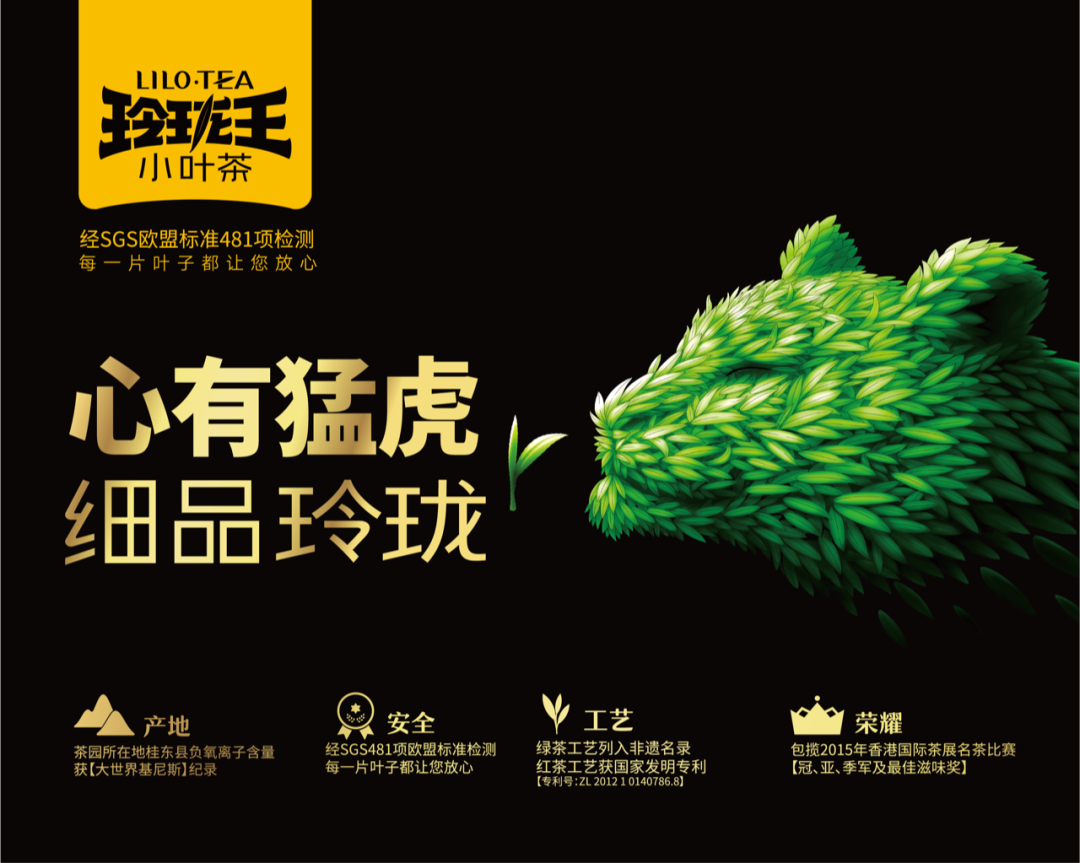 這個(gè)大白話也非常符合玲瓏王的戰(zhàn)略目標(biāo),做小葉茶標(biāo)準(zhǔn)的創(chuàng)領(lǐng)者,也就是王者。那么玲瓏王小葉茶的符號(hào)創(chuàng)意就是要表達(dá)路邊大眾說(shuō)的“小葉子的王”。