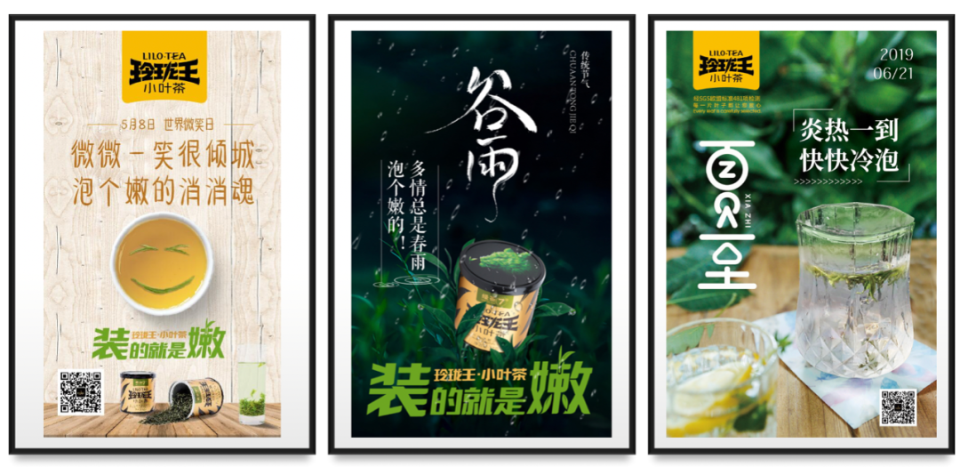 為了讓消費(fèi)者對(duì)產(chǎn)品的認(rèn)知更清晰,弘道經(jīng)邦給玲瓏王小葉茶旗下兩大產(chǎn)品線各自做了一句話的解讀,“紅茶越小越嫩越柔”、“綠茶越小越嫩越鮮”,分別用1個(gè)字“鮮”和“柔”定義綠茶和紅茶的產(chǎn)品價(jià)值屬性,從而更好的反哺和強(qiáng)化“小”和“嫩”。